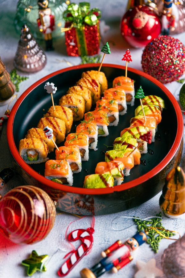 Un surprenant Roll au Saumon Gravlax façon Nikkei. In : Saumon – Avocat / Out : Saumon Gravlax Nikkei (Aneth – Yuzu – Kumquat – Baies Roses – Fleur de Sel)