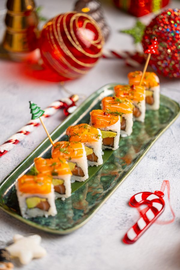 Un surprenant Roll au Saumon Gravlax façon Nikkei. In : Saumon – Avocat / Out : Saumon Gravlax Nikkei (Aneth – Yuzu – Kumquat – Baies Roses – Fleur de Sel)