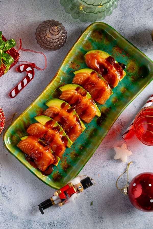 Saumon – Avocat – Ikura – Sauces Nikkei, Black Mamba et BSK – Sésame. Servi avec un Bol de Riz.
